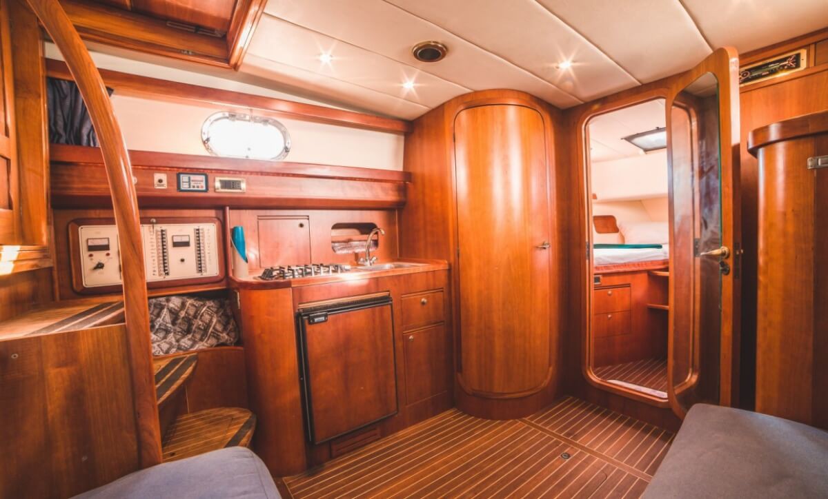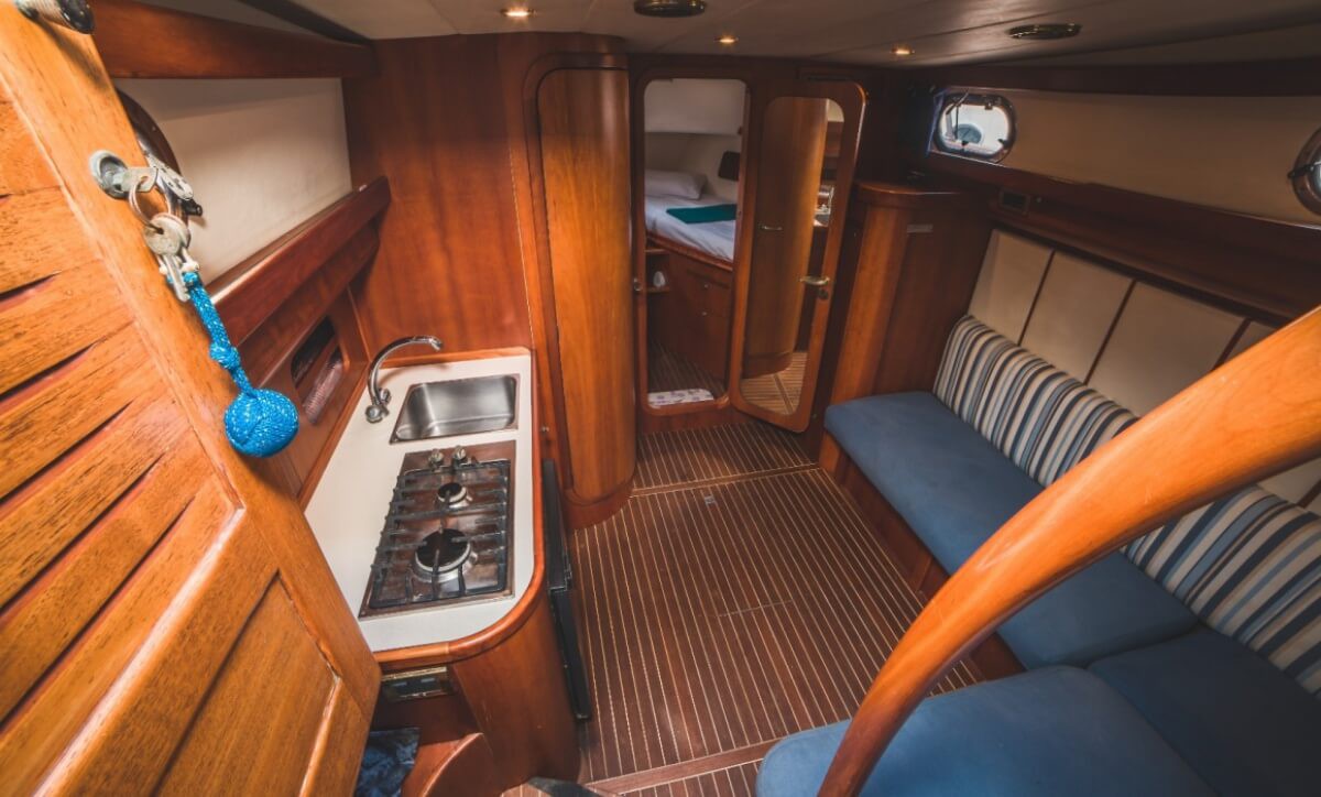 Inside, the Apreamare 38 Confort welcomes you with a beautifully finished cabin featuring premium materials, two comfortable berths, and the option to convert the dinette into additional sleeping space. A fully equipped kitchen and a spacious, elegant bathroom ensure the highest level of comfort during your entire cruise.