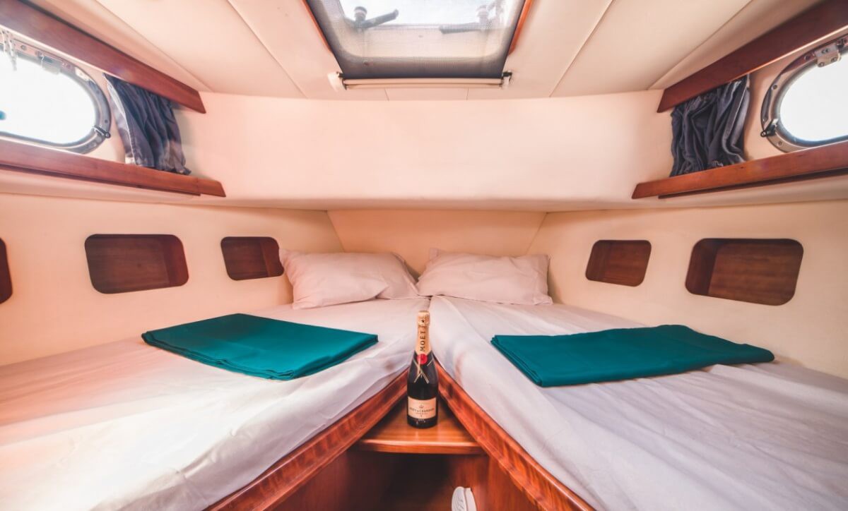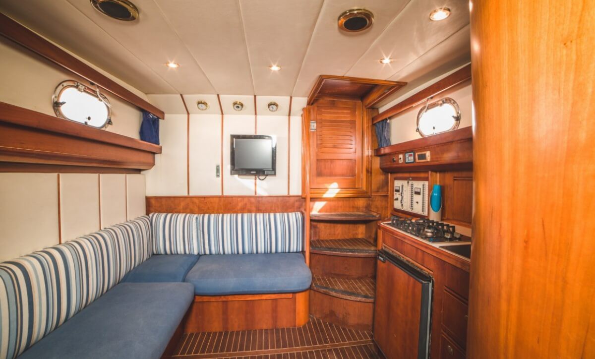 Outside, the boat shines with its signature teak foredeck, offering a wide sunbathing area perfect for relaxing under the Mediterranean sky. The generous aft cockpit, enriched with soft cushions and a protective awning, creates an intimate open-air lounge where guests can enjoy breathtaking views and a smooth, luxurious navigation.