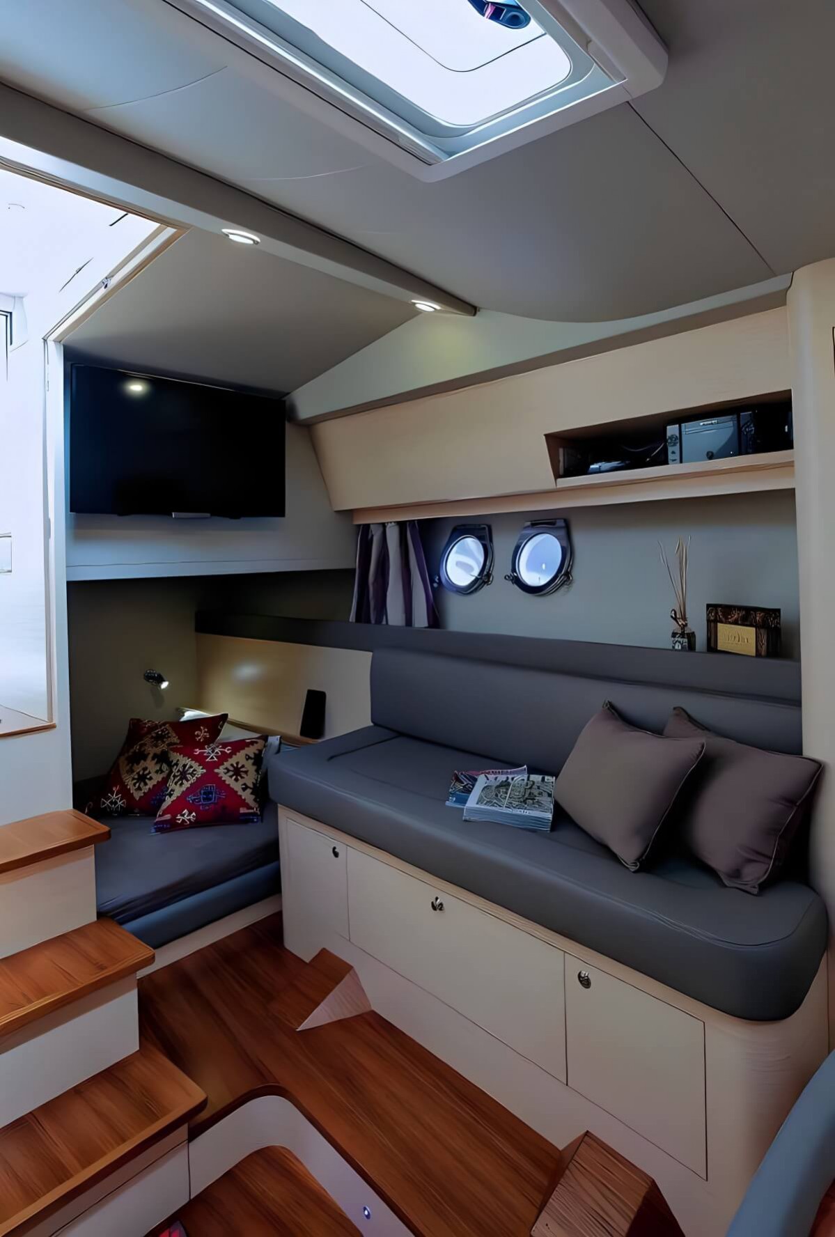 A beautifully designed lounge-style helm station, complete with a comfortable dinette and fully equipped galley. Below deck, you’ll find two elegant cabins and one refined bathroom, offering ample comfort for day cruises or weekend escapes.