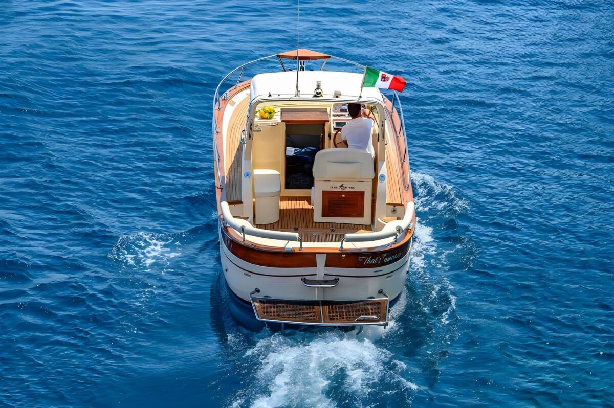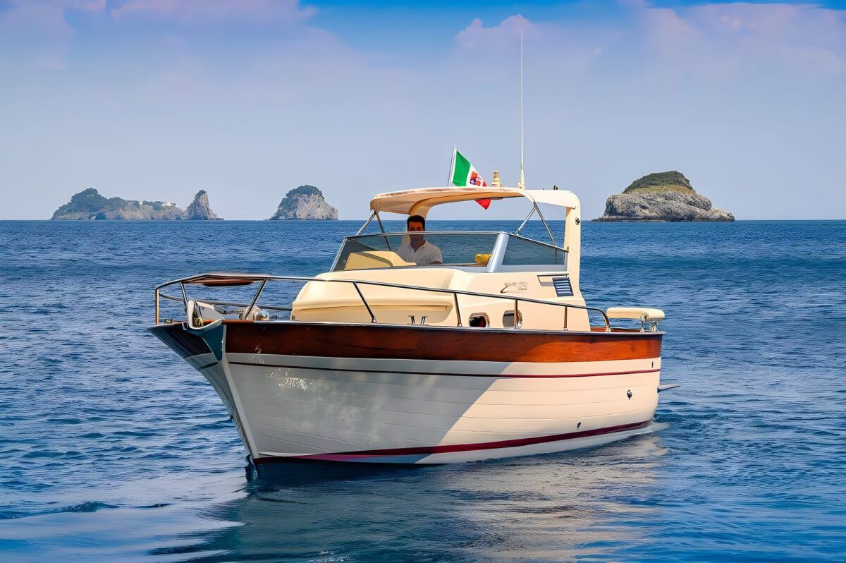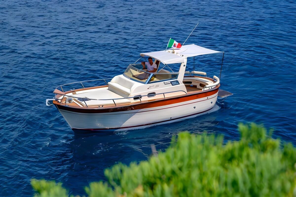 Onboard, you’ll find a cozy cabin, a functional bathroom, spacious sunbathing areas, and a shaded cockpit perfect for enjoying the coastline in total comfort. Whether you want to swim in hidden coves, explore famous landmarks like the Faraglioni of Capri, or admire the cliffs of Positano and the legendary Amalfi Coast, the Jeranto 28 delivers an exclusive and authentic Italian boating experience.
